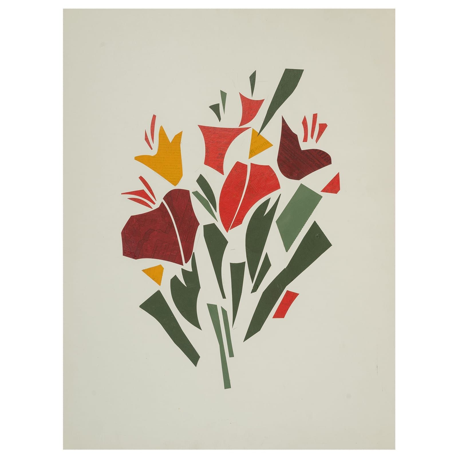Pintura e colagem sobre papel do artista Carlos Scliar, estudo para serigrafias editadas nos ateliês da Editora Lithos. Como muitos desses estudos, sem assinatura. Obra adquirida diretamente do acervo da editora em 2012. Acompanha ficha com histórico da obra.