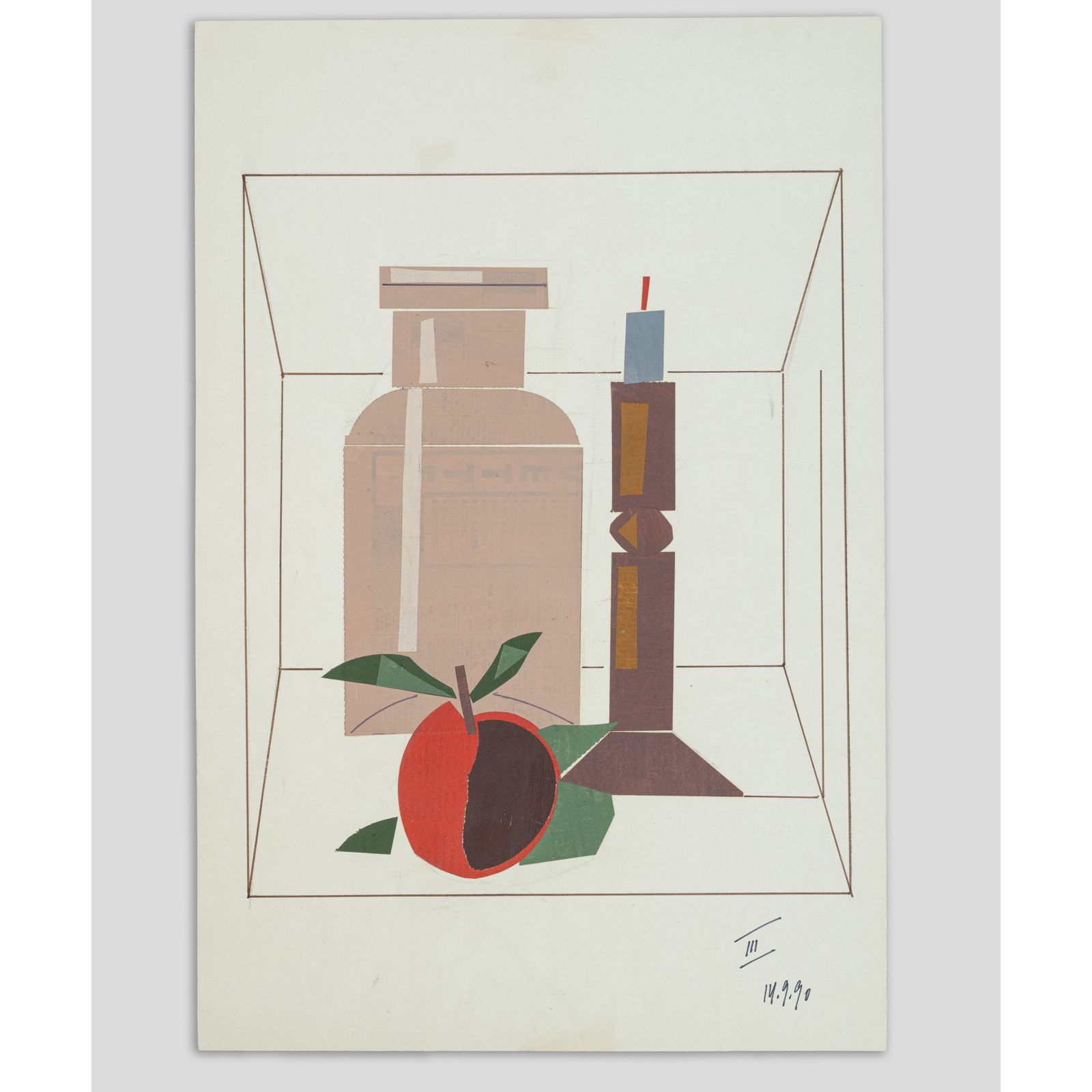 Pintura e colagem sobre papel do artista Carlos Scliar de 1990, estudo para serigrafias editadas nos ateliês da Editora Lithos. Como muitos desses estudos, sem assinatura. Obra adquirida diretamente do acervo da editora em 2012. Acompanha ficha com histórico da obra.